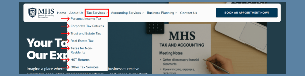 Please refer to the “Tax Services” section in the website header above. There, you will find all available options in the dropdown menu, each with its own details.